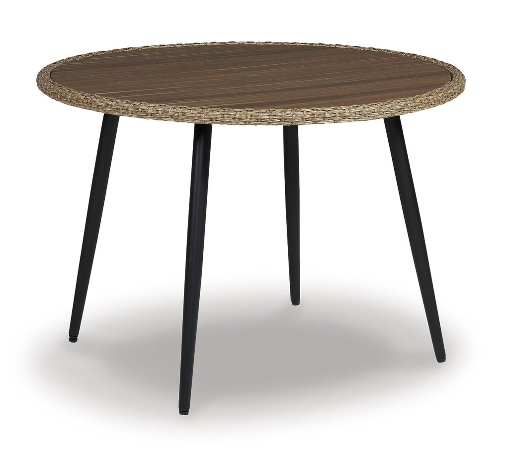 This outdoor seating set establishes the standard for alfresco dining. Made of weather-resistant materials, the table and chairs are ready to withstand the elements. Plus, the two-tone color scheme adds another layer of interest to your outdoor decor.