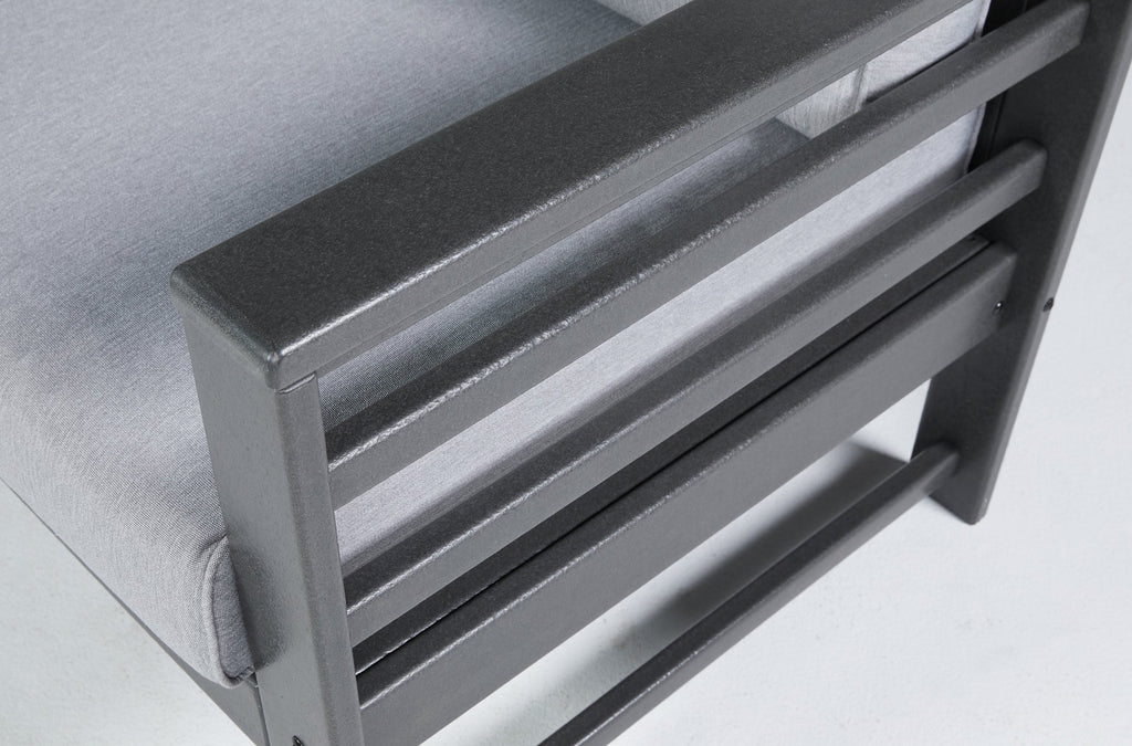 Indulgently comfortable furniture shouldn't be limited to inside spaces. Create your own outdoor oasis with this cushioned lounge chair. A study in form and function, the trend-right charcoal gray frame is crafted from MEGA TUFF™ HDPE material for durability and weather resistance. Cushions wrapped in high-performing Nuvella® fabric are comfortable and carefree.
