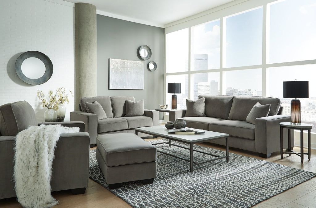 Serving up a refined, upscale look—at an incomparable value price—this sofa and loveseat package lures from every angle. Crisp box cushioning, wide track arms and black tapered feet lend a clean, contemporary aesthetic. Velvety soft upholstery in a chic sandstone gray takes neutral to another level.