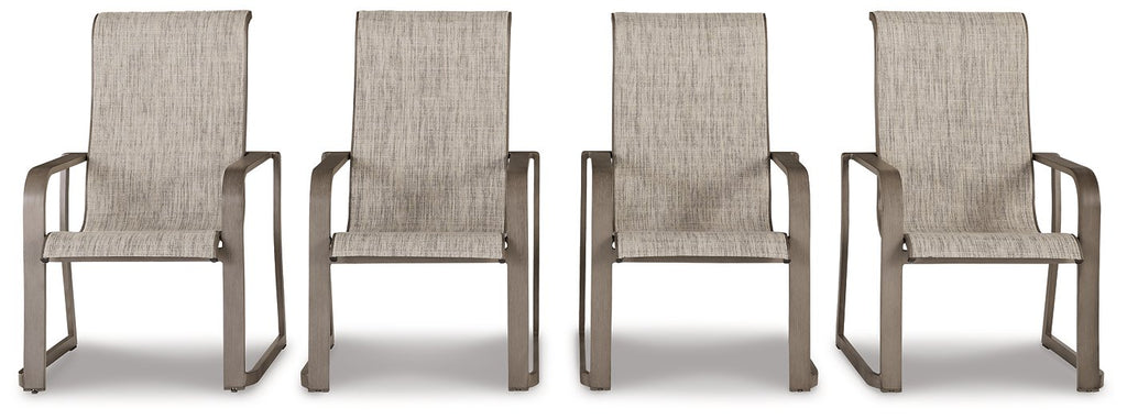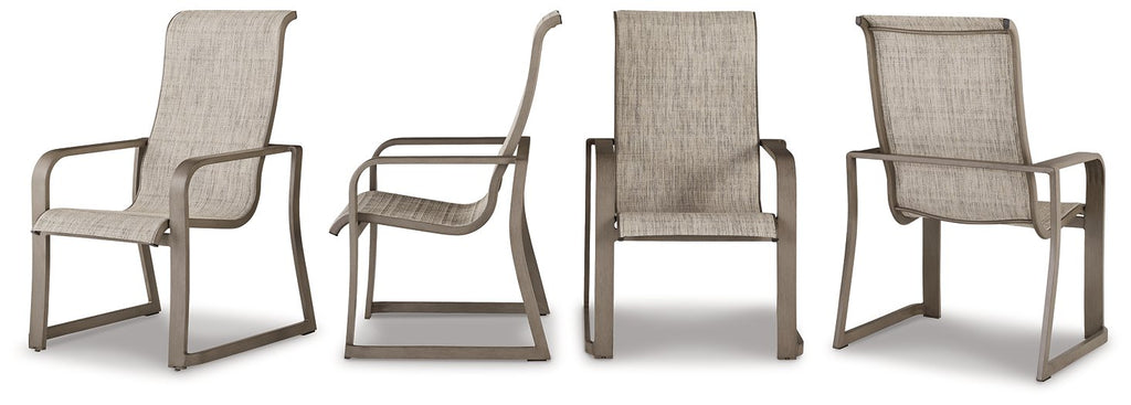 Balancing effortless natural beauty and minimalist design, this sling arm chair seamlessly brings your contemporary style outdoors. Sporting a sled base design and wood-look finish, it entices with a fresh-feeling neutral sling fabric over the high back. This sleek yet durably made chair refines the art of relaxed outdoor living.