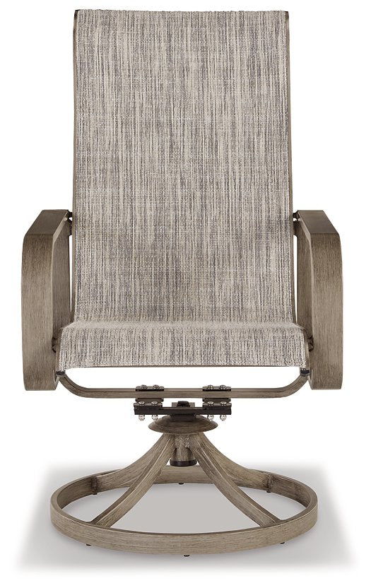 Balancing effortless natural beauty and minimalist design, this sling swivel chair seamlessly brings your contemporary style outdoors. Sporting a 360-degree swivel base and wood-look finish, it entices with a fresh-feeling neutral sling fabric over the high back. This sleek yet durably made chair refines the art of relaxed outdoor living.