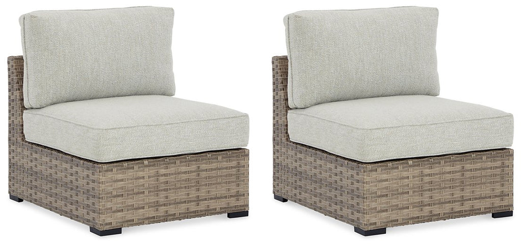 This cool, casual outdoor chair will raise the comfort level and visual appeal of your outdoor living space. Made of handwoven wicker in easy-going beige tones, the cushioned armless chair blends beautifully into your lanai or pool and patio area with thick, comfy cushions wrapped in Nuvella® high performance fabric that is stain resistant, fade resistant and easy to clean. This outdoor chair can be used on its own or paired with other pieces of the matching sectional to create a space that holds up to Mother Nature and ages gracefully for years of enjoyment.