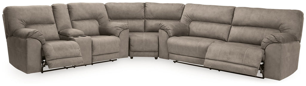 Strike a balance between the indulgent comfort you crave and the cool aesthetic you long for with this reclining sectional. Offering the cool look of weathered leather, the feel-good slate-tone upholstery takes neutral to new heights. Simply chic divided back tailoring and jumbo stitching are among the finer details that make all the difference.