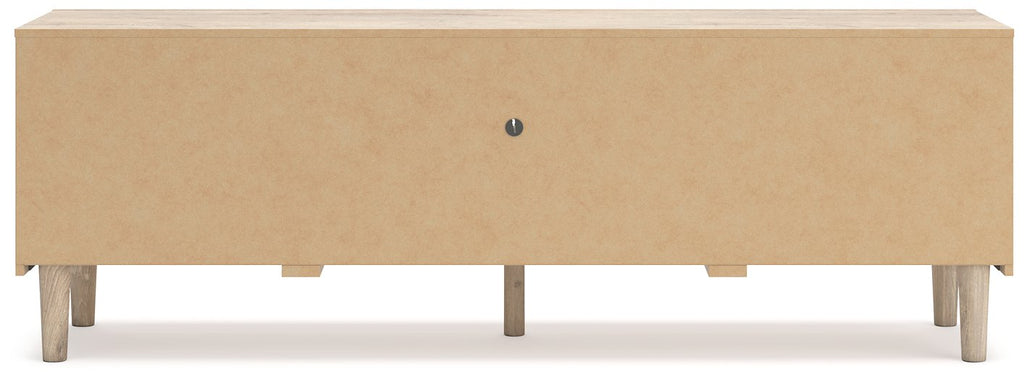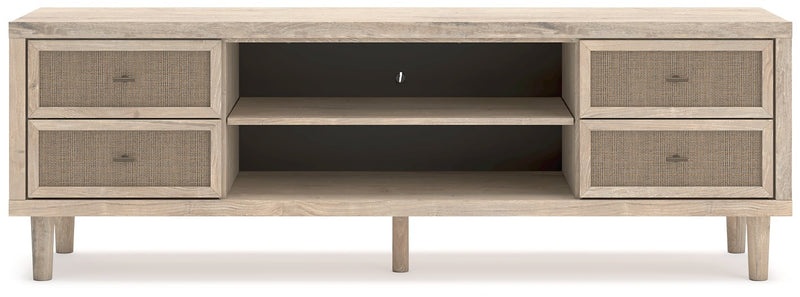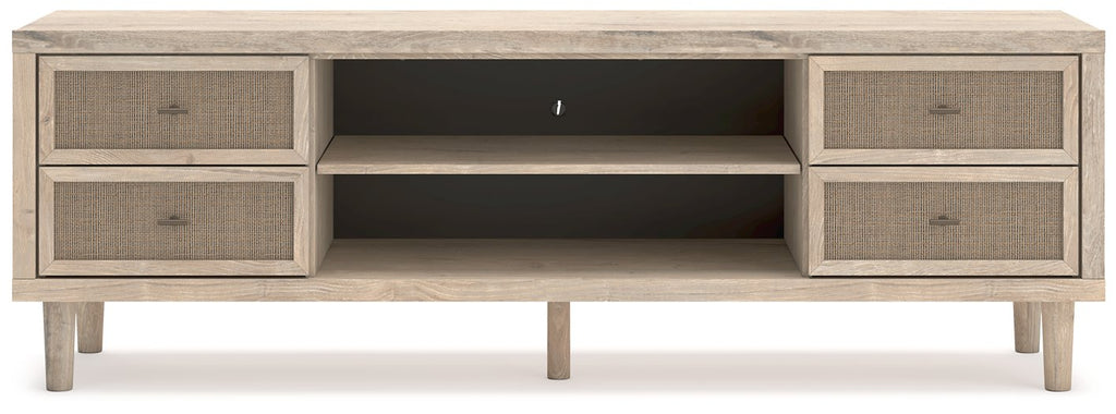 Clean-lined and contemporary—but far from stark—this TV stand is a fresh style awakening. Pairing a light finish with replicated oak grain and textured beige cane details, its mixed materials bring a naturally versatile vibe to your favorite spot for binge-watching or gaming. Sleek, simple hardware plays perfectly with the modern aesthetic. And prepare to have your mind blown by the vast universe of storage possibilities within the spacious drawers and open shelving.