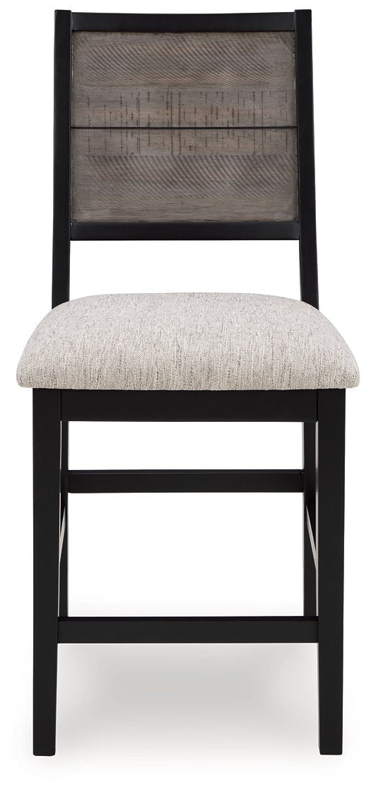 Refresh your dining area with this five-piece counter height table set. The table's two-tone finish pairs a distressed weathered gray wood tone with a matte black frame. The bar stools have stylish bent plank backs and comfy upholstered seats for an on-trend look you’ll love. This stunning dining furniture is ready to impress your guests and create unforgettable memories.
