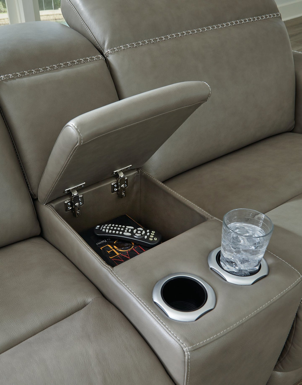 Truly putting high design into recline, this power reclining sectional with chaise with gray leather match upholstery proves that just because you’re a recliner doesn’t mean you have to look like one. Deceptively beautiful, its ultra clean-lined aesthetic is as cool and contemporary as they come. Low-profile back has a super swank look. When you need more support for your head and neck, the press of a button engages the Easy View™ power adjustable headrest, designed to let you lean back and still have a primo view of the TV. Ever-so-subtle curves and stunning stitching perfect the aesthetic.