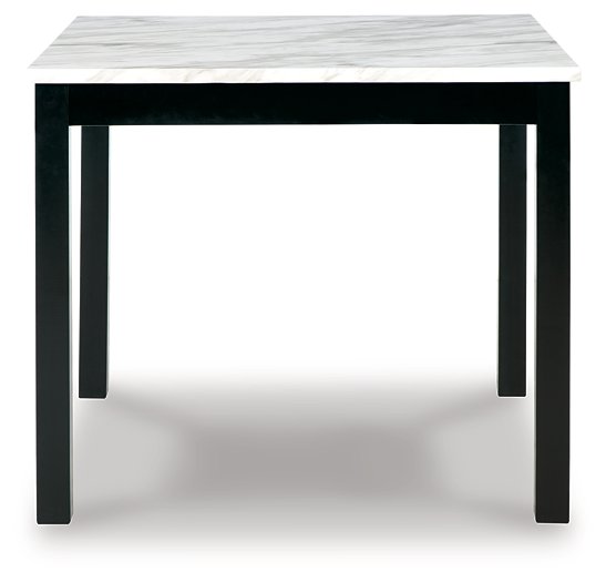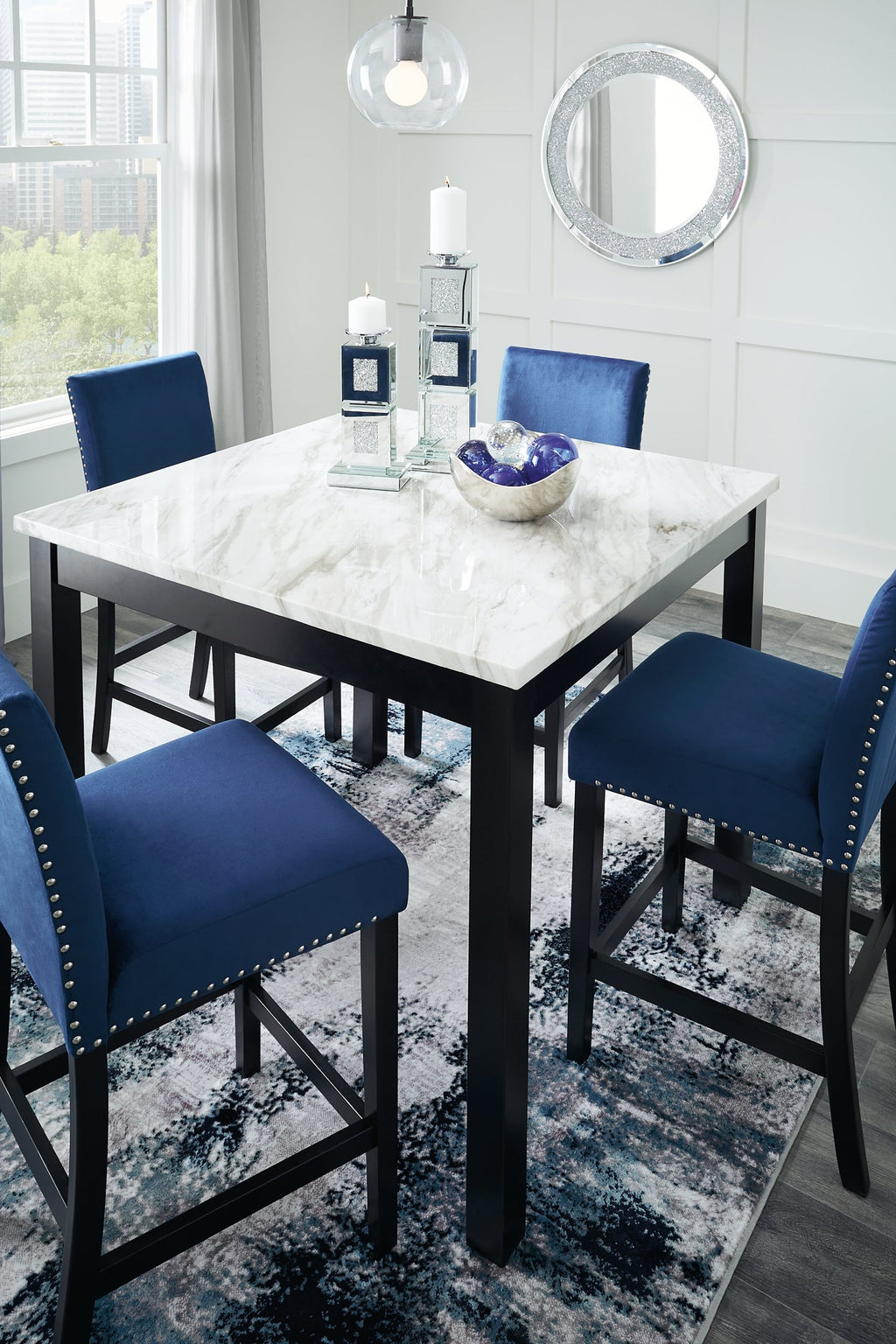 Curate a dining nook brimming with the glamorous contemporary style you love with this counter height dining set. Replicated Carrara marble laminate gives the tabletop a glam appeal, balanced by a matte black base. Four counter height bar stools, with sumptuous blue velvet upholstery and polished nailhead trim, complete the set.