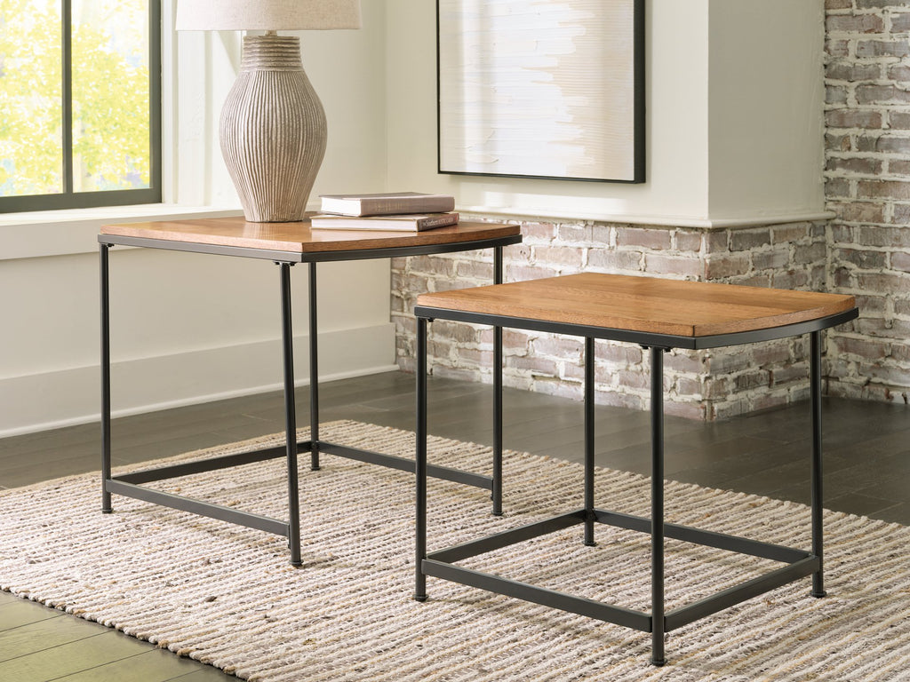 Make your nest that much more luxurious with this pair of nesting tables. The light brown natural wood tone and contrasting black metal frames add a rustically refined look that feels right at home.