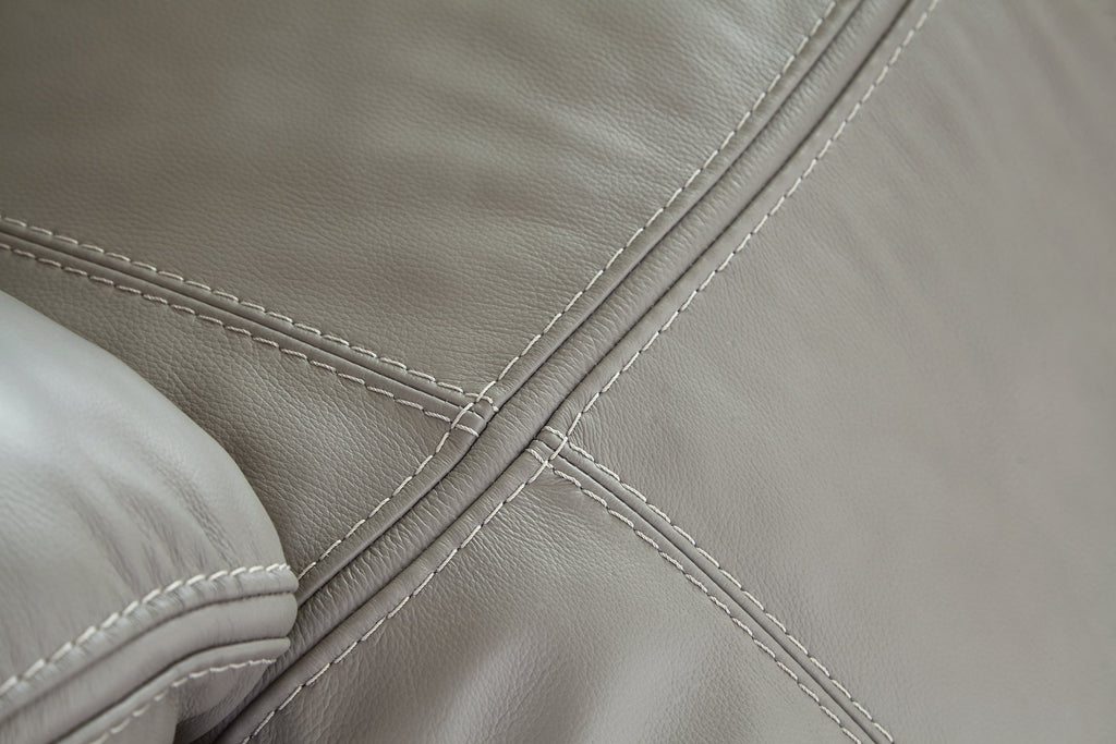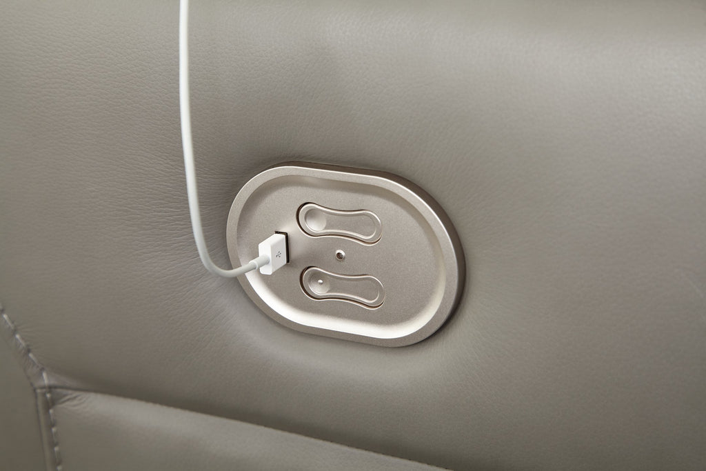 Load up on comfort in a cool, clean-lined and contemporary way with this power reclining loveseat in chocolate brown. Rest assured, the leather match upholstery is enriched with a pebble grain effect for authentic appeal and enhanced with jumbo stitching for dramatic contrast. It features a one-touch power control with adjustable positions, along with an Easy View™ adjustable headrest that allows a primo view of the TV even when you're reclined. Extended ottomans provide extra length for leg comfort. A zero-draw USB plug-in at your fingertips lets you charge up as you chill out.