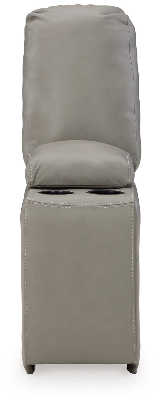 Load up on comfort in a cool, clean-lined and contemporary way with this power reclining sectional. Rest assured, the leather match upholstery is enriched with a pebble grain effect for authentic appeal and enhanced with jumbo stitching for dramatic contrast. It features a one-touch power control with adjustable positions and includes an Easy View™ adjustable headrest that allows a primo view of the TV even when you're reclined. Extended ottomans provide extra length for leg comfort. A zero-draw USB plug-in at your fingertips lets you charge up as you chill out.