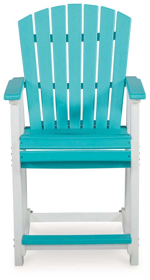 Raise the bar on outdoor living with this bar stool set. Crafted for style and durability, the counter height stool caters with sturdy armrests, an ample footrest, a high shell back and a waterfall wrapped seat for curvaceous comfort. The slatted design easily sheds rainwater. Adding to its appeal: a standout two-tone look that pairs a light turquoise and white for twice the interest.