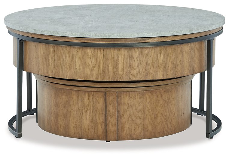 Beautiful to behold, this nesting coffee table set is loaded with style. Featuring an urban contemporary profile, the coffee table features a suspended drum design and a durable faux cement melamine lift top with hidden storage. Equipped with casters for easy access, the rolling trunk does double duty as serving space and storage. Perfect for mixed-use living arrangements.