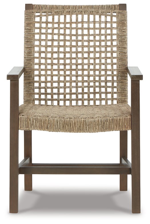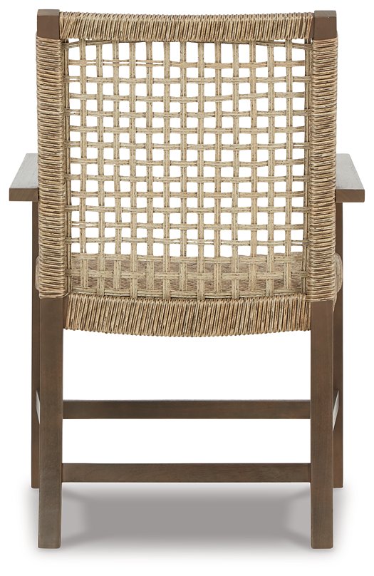 Dream weaver. Round out your indoor or outdoor living space with the naturally beautiful look of wood and wicker. This arm chair will serve up seasons of worry-free dining in your sunroom, on your back deck or sitting pretty poolside. The chair's open-weave design is made from woven resin and eucalyptus wood, for the perfect merger of high fashion and lasting durability.