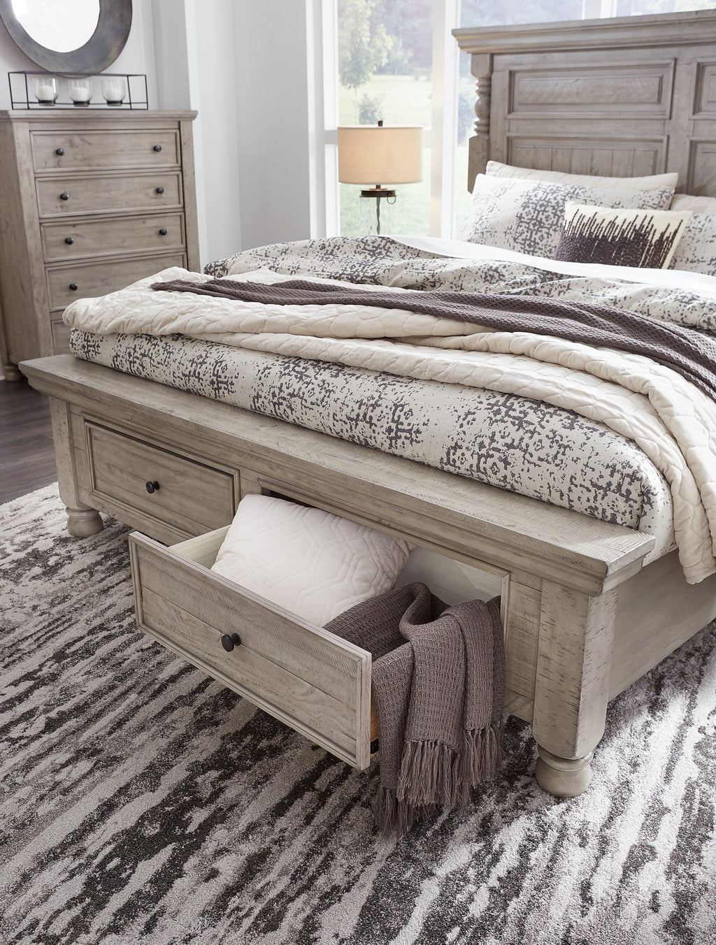 Embrace the feel of a mansion in the countryside when you revel in the romance of this queen panel bed. With its weathered light gray finish, substantial presence and thick mouldings, the piece has a sense of timeless beauty. Instantly the highlight of your home, this picturesque bed features turned posts that seamlessly connect to the main panels. The footboard’s two smooth-gliding storage drawers with aged iron-tone knobs are a stately finishing touch.