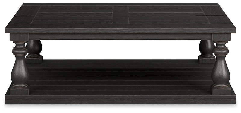 This generously scaled coffee table in black has a dramatic presence—exactly what an eclectically styled room needs. Solid wood planks and thick veneer merge seamlessly together for a hearty helping of style. Handsomely turned legs connect to a lower shelf flush with the floor. A rustic wirebrush technique gives this stunning rectangular coffee table in black with show-through contrasting just enough of a weathered sensibility.