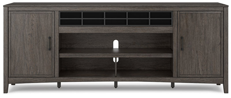 Cool and clean, yet warm and inviting. This TV stand has so many standout qualities, making it an inspired choice for your dream decor. A prime example of “casual contemporary†style at its very best, the designer piece is dressed to impress in a medium gray-brown finish with a blackened wood grain contrast. Spacious cabinets and shelves are ideal for storing items like your e-reader, TV remotes and other entertainment must-haves. The decorative grille on the upper shelf can conceal a soundbar for a sleek look. Enhancing the experience: the optional fireplace insert (sold separately) brings a touch of warmth and beautiful ambiance to your living room.