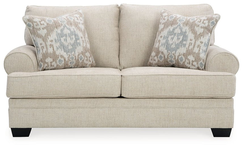 Generously scaled and richly versatile, this loveseat exemplifies the best in timeless classic style. It's splendidly tailored with transitional roll arms, for a look that's traditional yet far from stuffy. Light, fresh and loaded with multi-textural interest, the loveseat's soft chenille upholstery is pure pleasure for the senses. Accent pillows with soothing neutral tones are a natural fit.