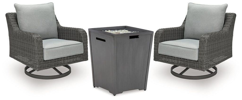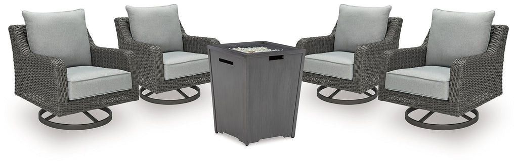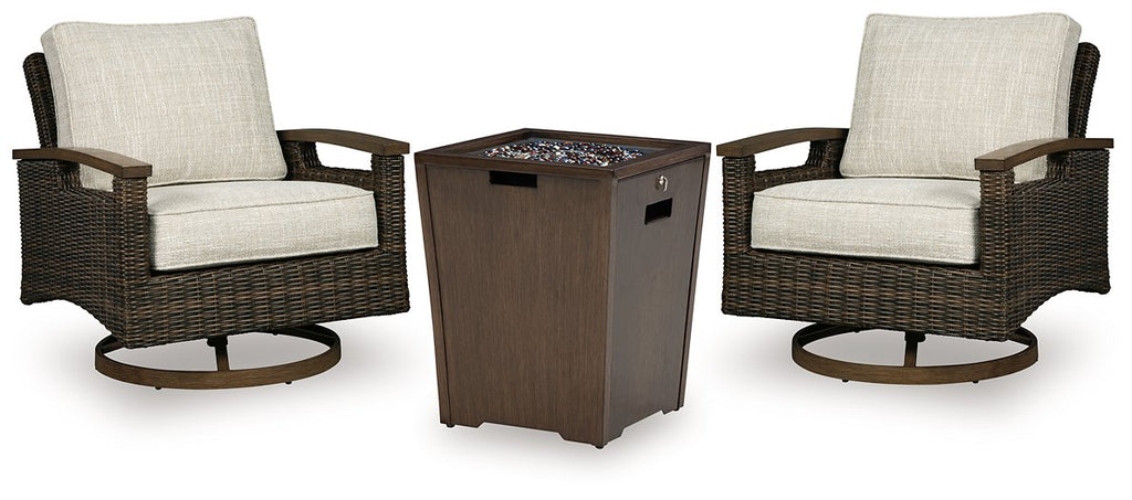 Sporting a hand-painted brown wood-look finish for a sense of earthy elegance, this fire pit table is sure to turn your backyard space into a hot spot for entertaining. The way its flickering flame seems to float on a bed of clear glass beads is truly mesmerizing. The resin wicker swivel chairs, with thick seat and back cushions wrapped in Nuvella® high-performance fabric, will weather the seasons beautifully.