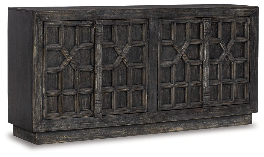 Whether you decide to use it as dining room storage or a living room TV stand, your love of unique style will shine front and center with this accent cabinet. The 4 distressed patterned door fronts finished in black and 2 fixed shelves add stylish versatility filled with possibilities.
