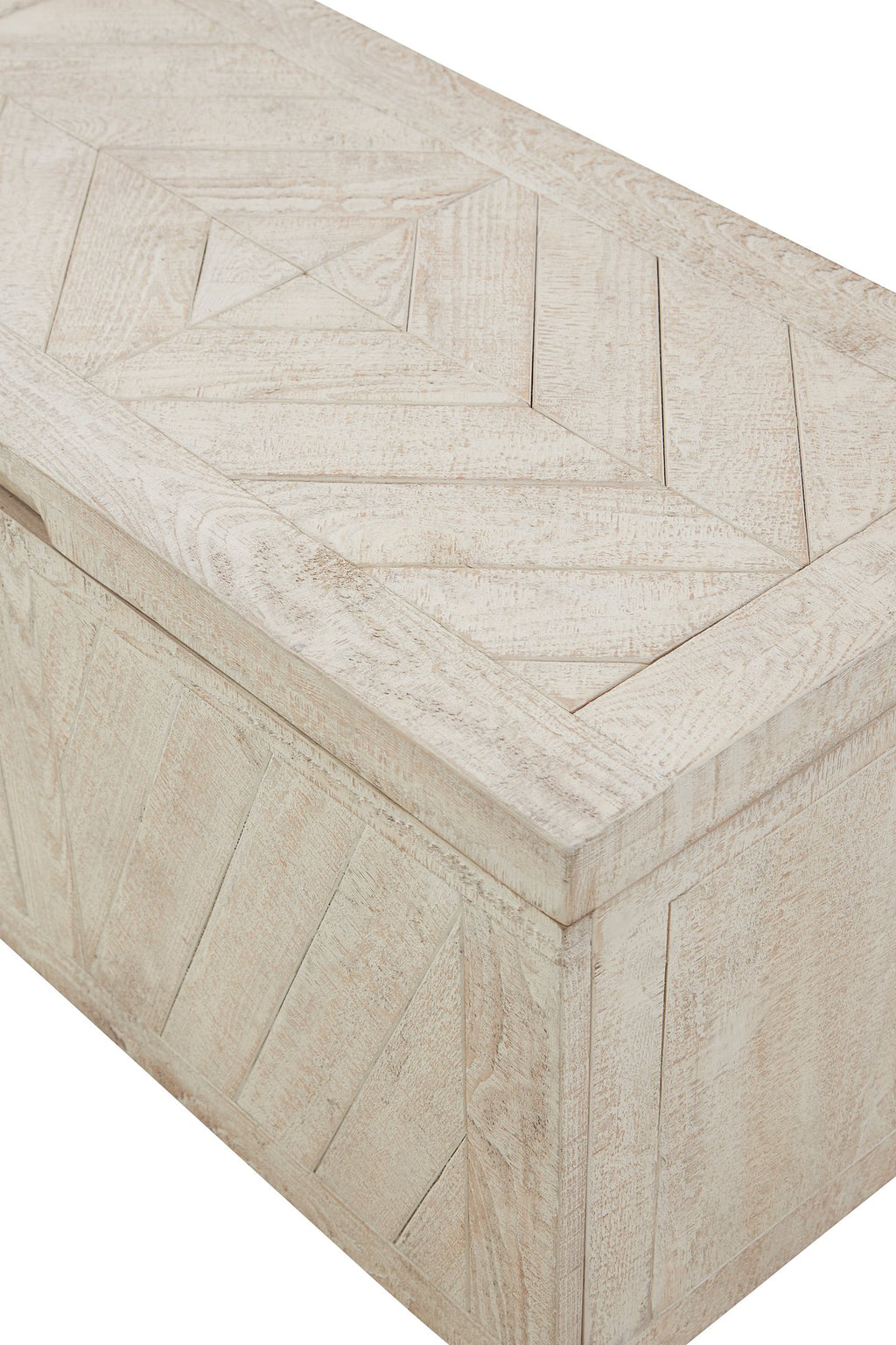 Perfect for storing throw blankets or other linens, this storage trunk is a stylish space-saving solution. Its distressed white finish paired with the diamond pattern top create an irresistible vintage vibe. Simply open the hinged top for a versatile storage space.