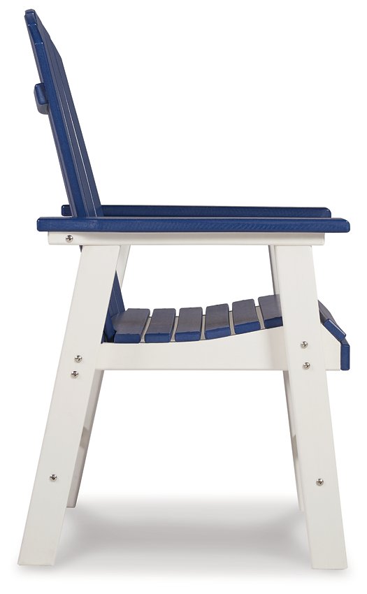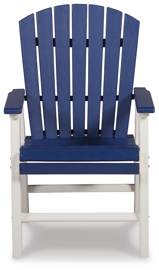 Pull up a chair on the back deck or poolside and gather around for good times. These two-tone outdoor dining chairs have sturdy legs in crisp white, with the arms, seat and back in a beautiful blue that matches the clear sky. A slatted seat and back allow drainage to prevent rainwater buildup. Designed to withstand harsh weather, this comfortably casual outdoor duo is made with durable MEGA TUFF™ HDPE material that won't chip, rust or peel.