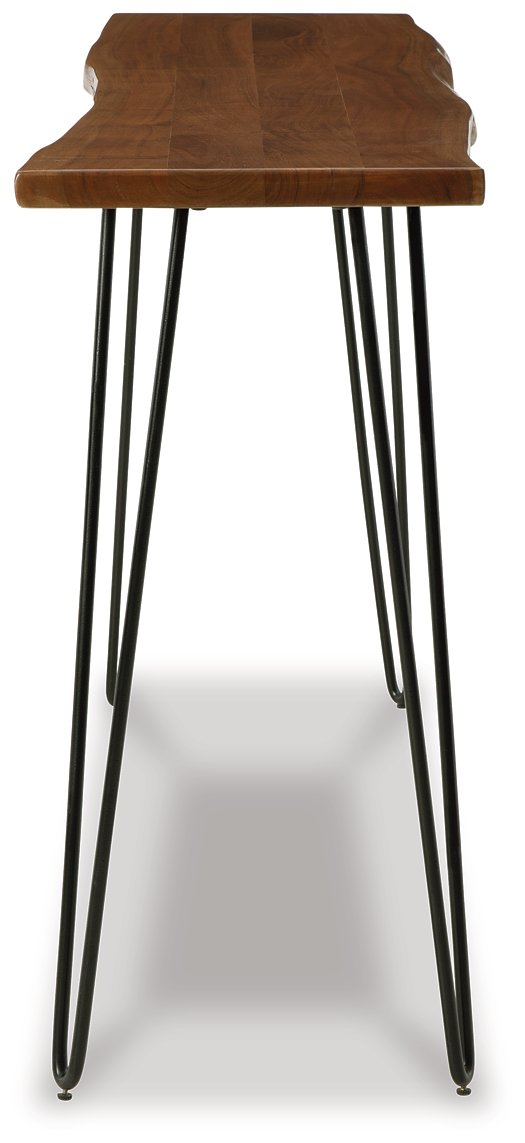 This stunningly simple solid mango wood dining table works effortlessly with contemporary decor. This narrow counter height table is perfect for smaller dining spaces. Or for added function, place it behind a sofa or sectional to make the most of your family room. The tabletop's gorgeous, natural-looking color contrasts nicely with the matte black metal legs, providing an instant upgrade to your space.